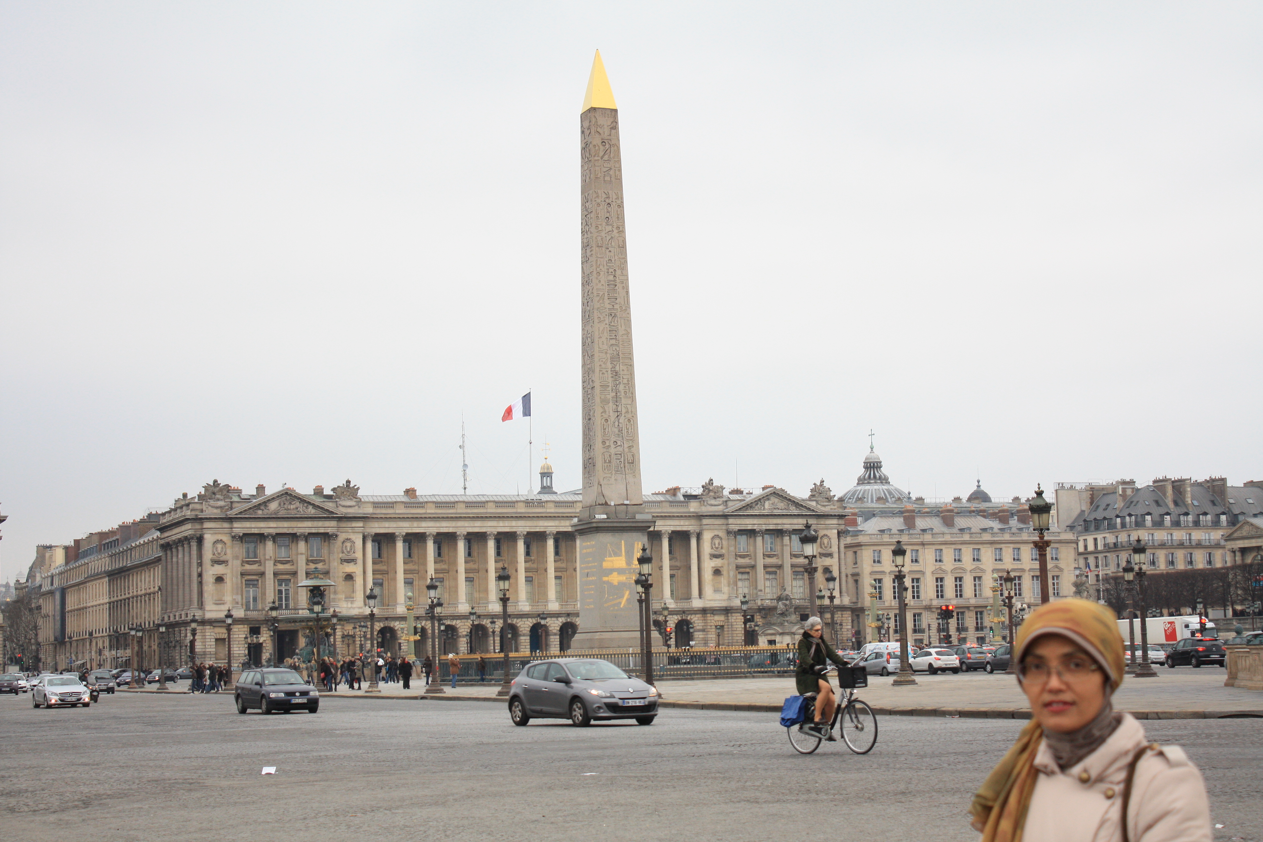 Sementara persis di bagian tengahnya berdiri tugu Obelisk, tugu kuno peninggalan raja Ramses, yang merupakan hadiah dari raja Mesir Mohammad Ali pada tahun 1829 untuk Perancis, sebagai lambang persahabatan ke 2 negara. Tugu ini diapit oleh 2 buah air mancur kembar nan indah mempesona, dengan patung-patung erotiknya, seperti biasa ..