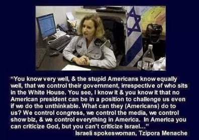 “Anda tidak bisa mengkritik Israel di negara ini dan bertahan. Kami dimiliki oleh propagandis musuh orang Arab. Tidak ada pertanyaan tentang hal itu. Kongres, Gedung Putih, dan Hollywood, Wall Street, dimiliki oleh Zionis. Tidak ada pertanyaan dalam pendapat saya. Mereka menutup mulut mereka dengan uang… Kami sedang didorong ke arah yang salah dalam segala hal.” ~ Helen Thomas, seorang veteran 50 tahun dari White House Press Corps, yang dipaksa untuk mengundurkan diri setelah dia tercatat pada rekaman video mengatakan orang-orang Yahudi Israel untuk “segera keluar dari Palestina.”