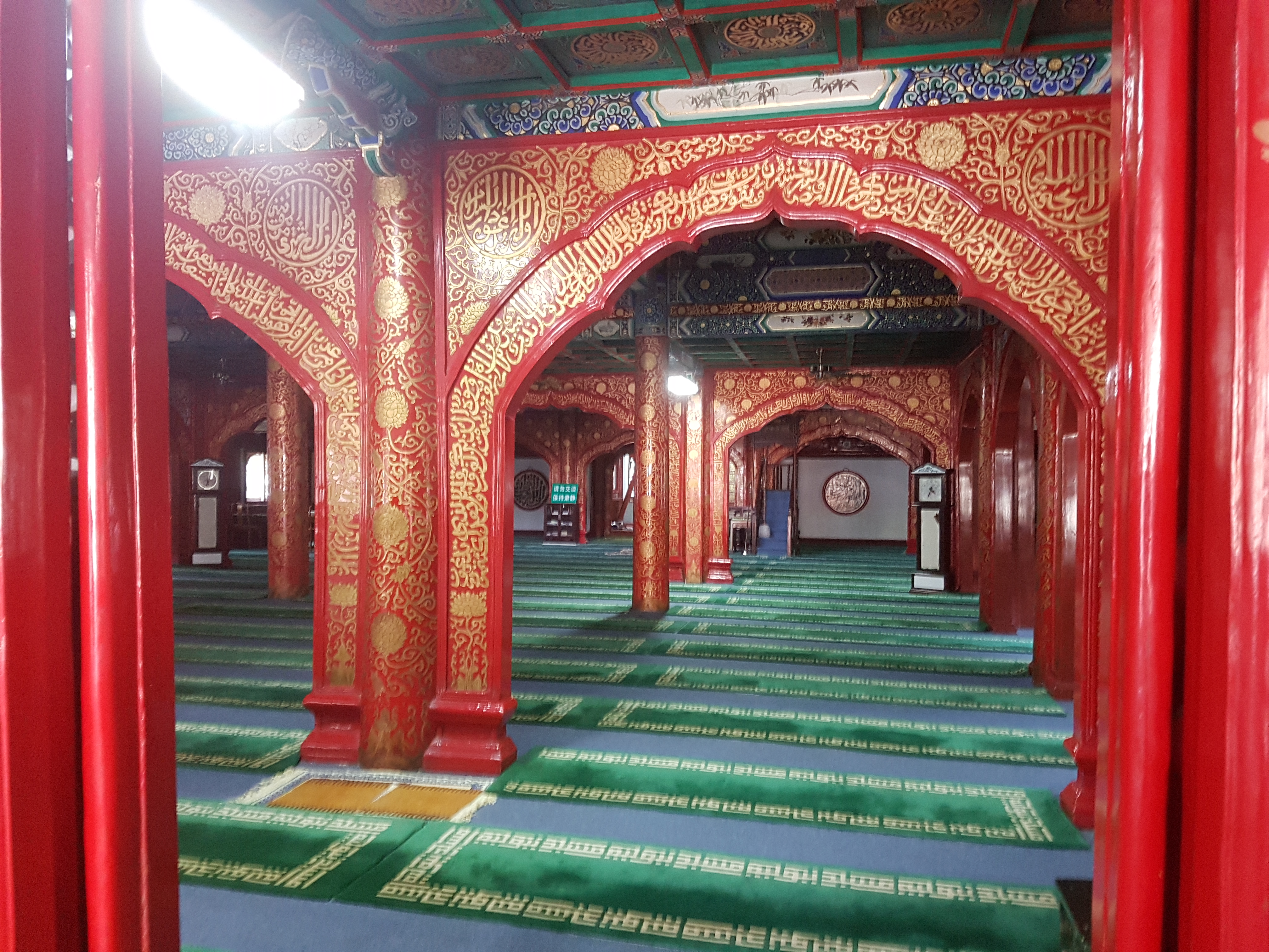 Selesai menikmati makan siang kami langsung menuju masjid. Sekali lagi berhubung masih ada waktu, kami menyempatkan diri untuk melihat-lihat kios-kios yang ada di sepanjang jalan menuju masjid, mengingatkan suasana pasar Seng seberang Masjidil Haram yang sekarang sudah tidak ada lagi itu. Aneka kerudung, tasbih dll bercampur dengan aneka pernak-pernik pajangan khas Cina.