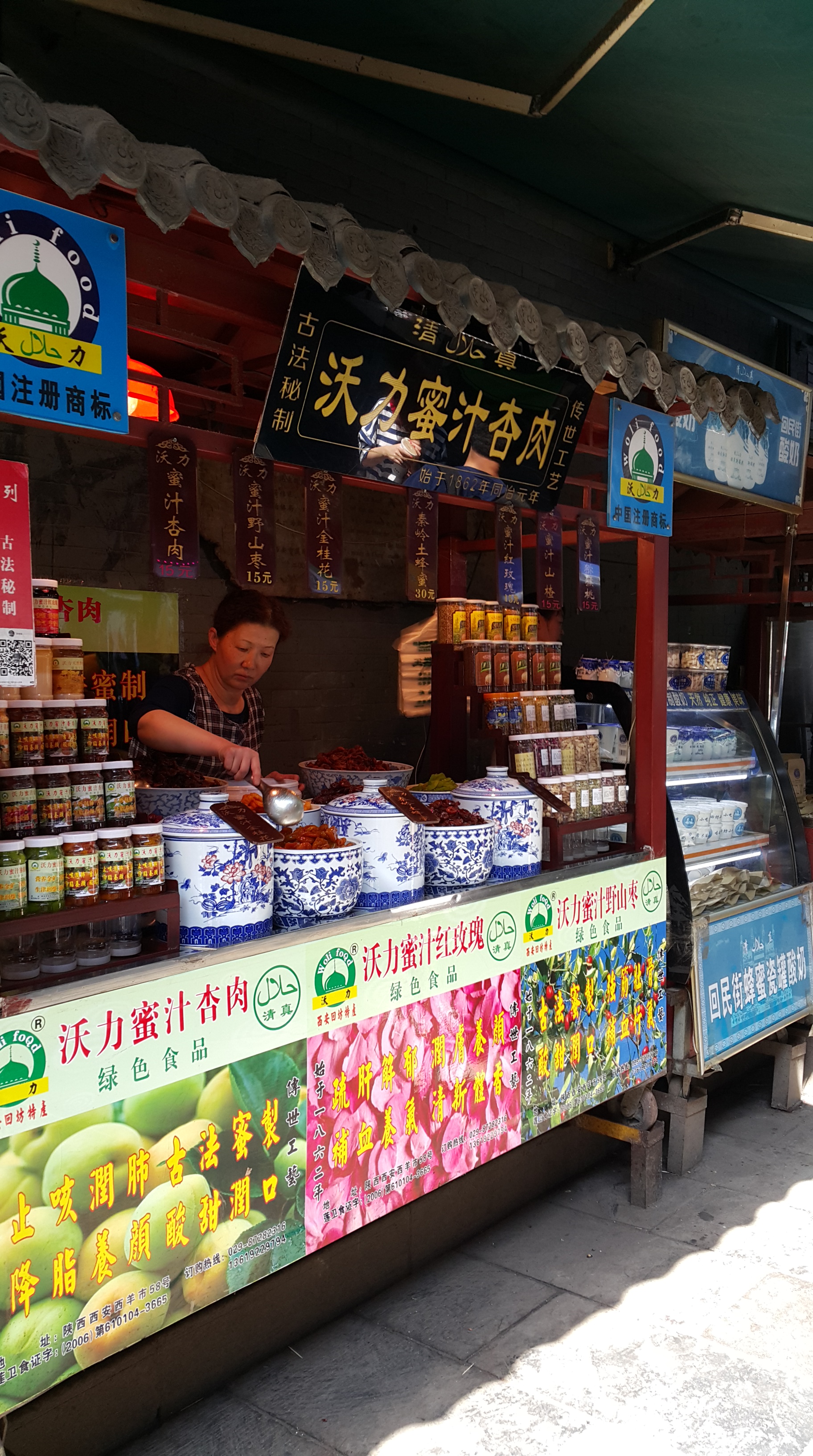 Masjid Agung Xian terletak di area Muslim dimana Muslim street berada. Begitu memasuki jalanan ini aroma Islami langsung terasa menyergap. Berbagai macam makanan terlihat menyesaki pedestrian lebar ini, dengan tulisan HALAL dalam huruf hijaiyah terpampang. Mulai aneka rempah-rempahan, bumbu masakan, aneka manisan hingga segala macam kue, sosis, sate dan lauk pauk ada di sini. Rasa senang, bahagia dan haru bercampur menjadi satu. Sungguh tak menyangka di negri yang jauh dari tanah suci dimana Islam hanya minoritas bisa menyaksikan hal seperti ini.