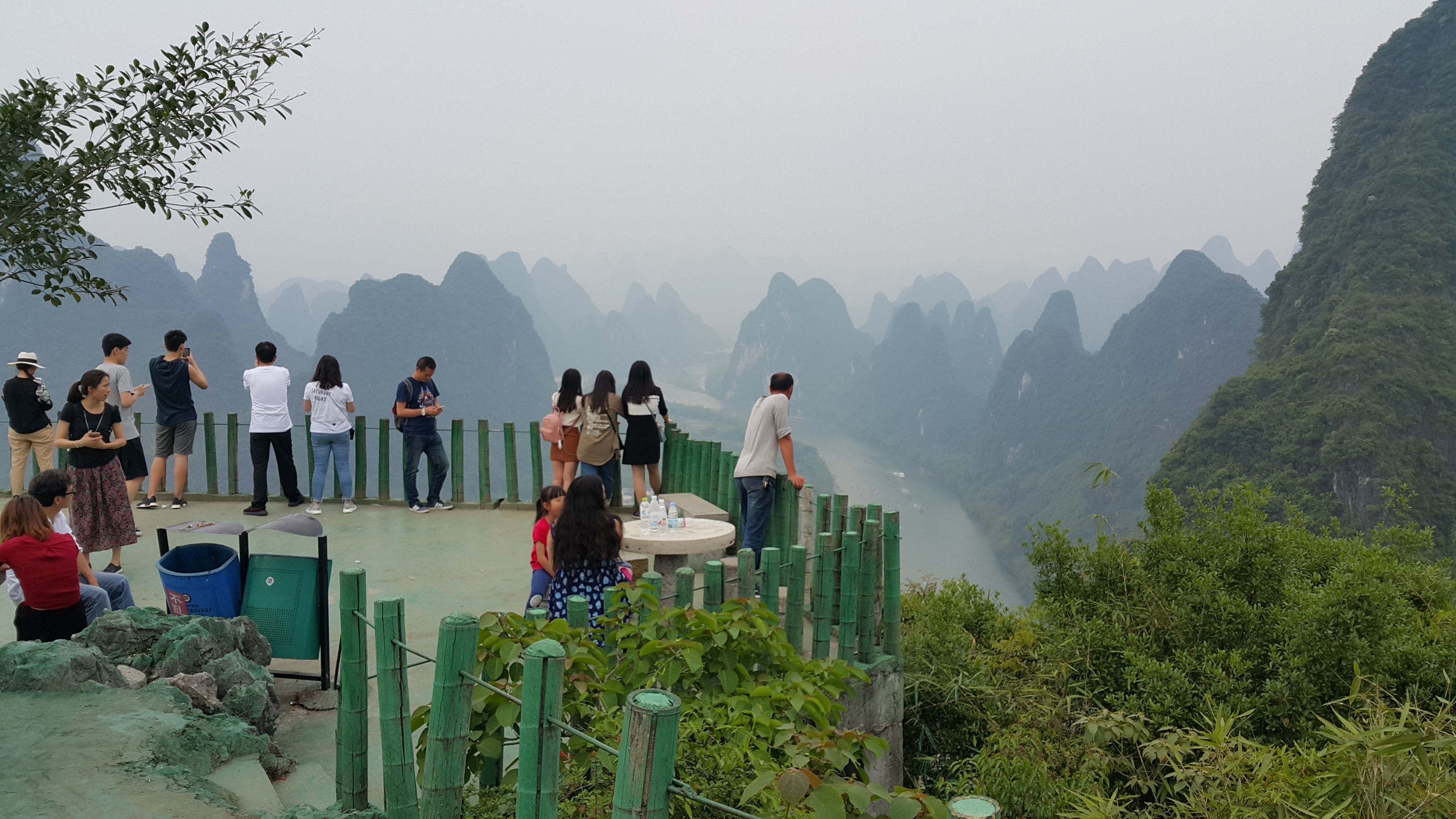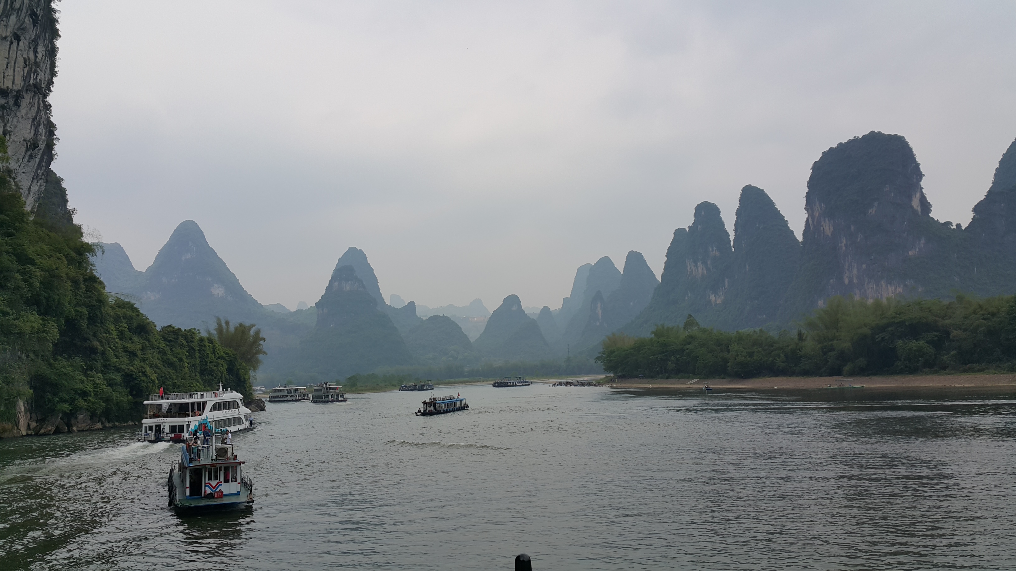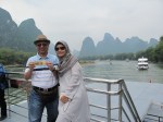 Kami mengawali penjelajahan dengan cruise menyusuri sungai Li yang panjangnya 83 km. Waktu berlalu tidak terasa terlalu lama berkat pemandangan yang sungguh mencengangkan. Dari sejak awal hingga usai perjalanan, tumpukan gunung dengan bermacam bentuk dan ketinggian, menyesaki pandangan. Masya Allah …