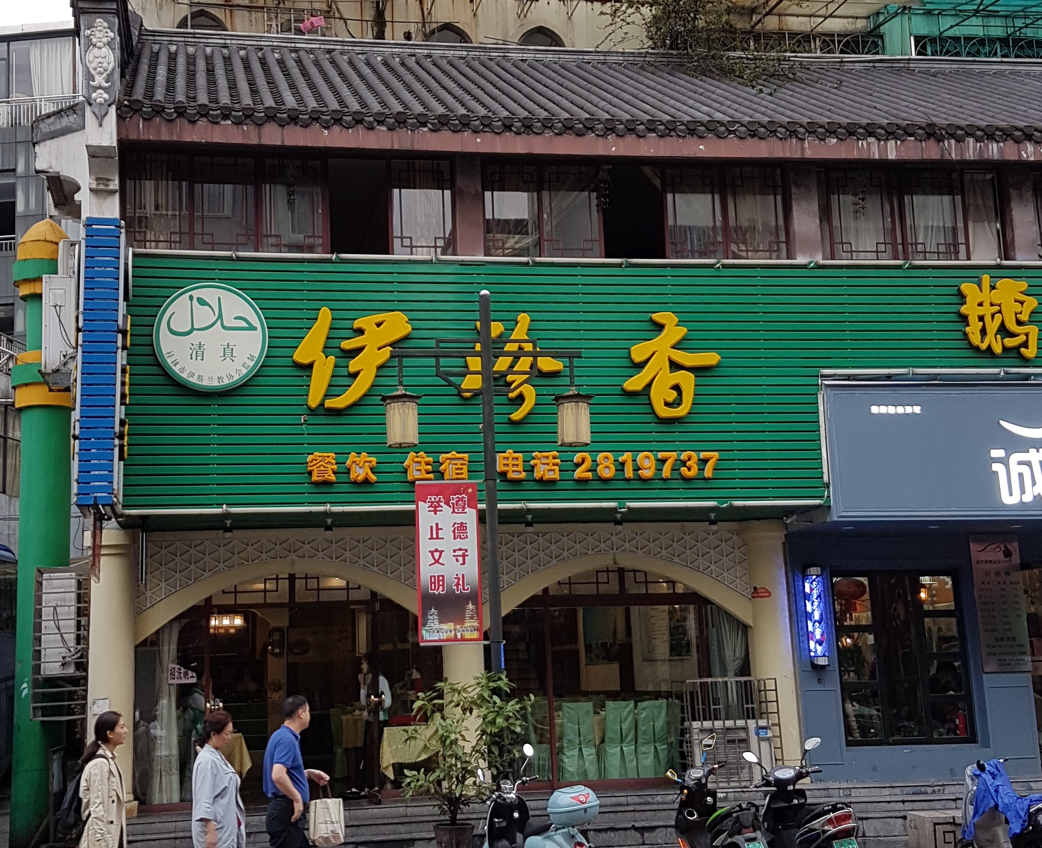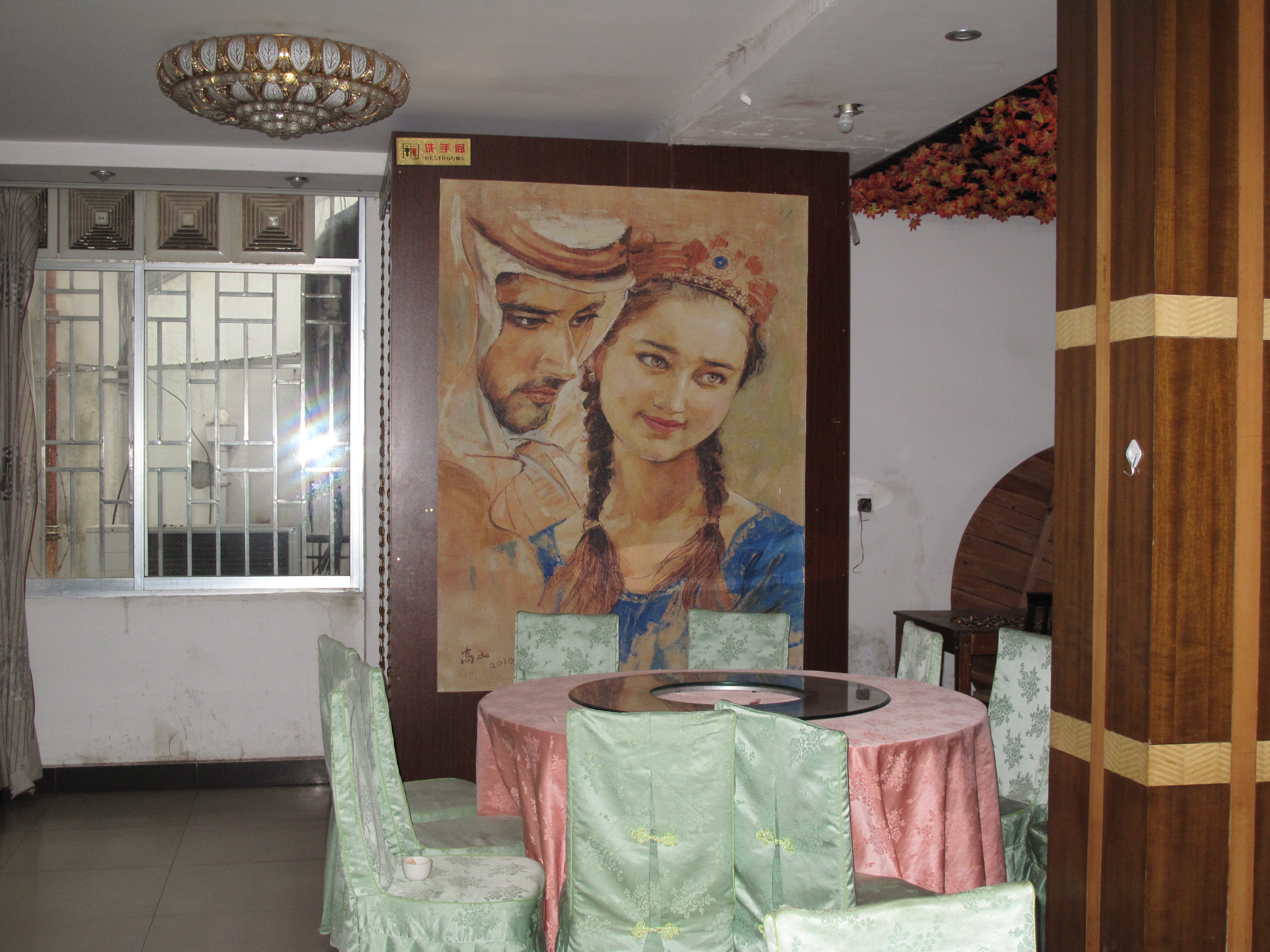 Namun yang di luar perkiraan adalah keberadaan masjid dan restoran halal di kota ini. Di restoran yang kami kunjungi untuk makan siang maupun malam tersebut terpampang lukisan besar pasangan muda-mudi, pemudanya adalah laki-laki Arab khas dengan pakaiannya sedangkan pemudinya adalah seorang gadis Cina dengan kepang rambutnya. Mungkin pemilik restoran, bisik saya kepada suami .. sotoy … 🙂