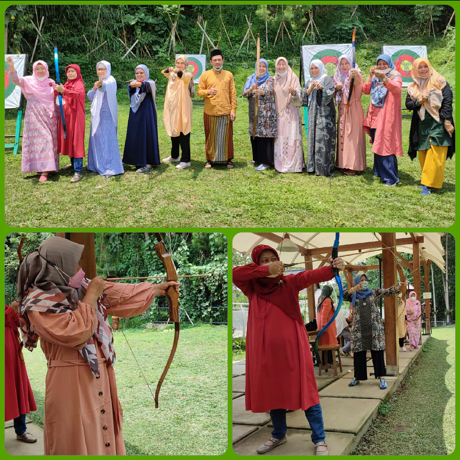 Sejak beberapa tahun terakhir ini banyak pesantren yang menjadikan panahan sebagai salah satu kegiatan mereka. Kegiatan olah raga yang masuk dalam kategori atletik ini ternyata tidak hanya diminati para santriwan santriwati namun juga para ibu jamaah MT (Majlis Taklim). Dengan penuh semangat para ibu tersebut mencoba mempraktekkan apa yang dicontohkan sang coach panahan yang tak jarang adalah seorang ustadz. Demikian pula kami, MT Raudhatul Jannah beberapa waktu lalu di lokasi panahan Emaki Al-Ma’soem Resort Lembang.